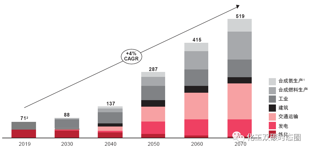 低碳氢被广泛认为是一种蕴藏丰富、用途广泛、清洁方便的能源载体,已被视为能源行业转型的关键一环。由于氢气与天然气属性相似,且二氧化碳排放量更低、自然蕴藏丰富,所以具有代替天然气的潜力。根据国际能源署可持续发展情景预测,到2070年,全球对氢气的需求预计将在 2019年7,000万吨的基础上增长7倍,达到5.2亿吨。