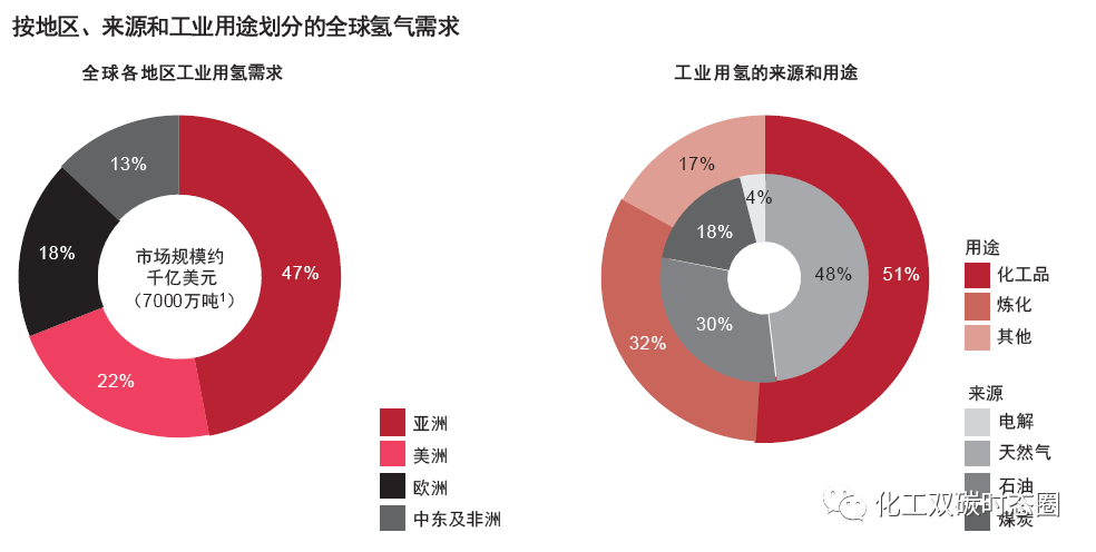 如果化石燃料相应减少,叠加氢气的低碳化生产因素,全球能源行业和工业加工领域有望在 2070年时实现碳中和。氢气的应用并不是新生事物。目前,氢气的年产量为7,000万吨,市场规模约为千亿美元。亚洲(48%),美洲(22%)和欧洲(18%) 紧随其后,而工业企业则是最大的使用群体,八成以上的需求来自炼化和化工行业。