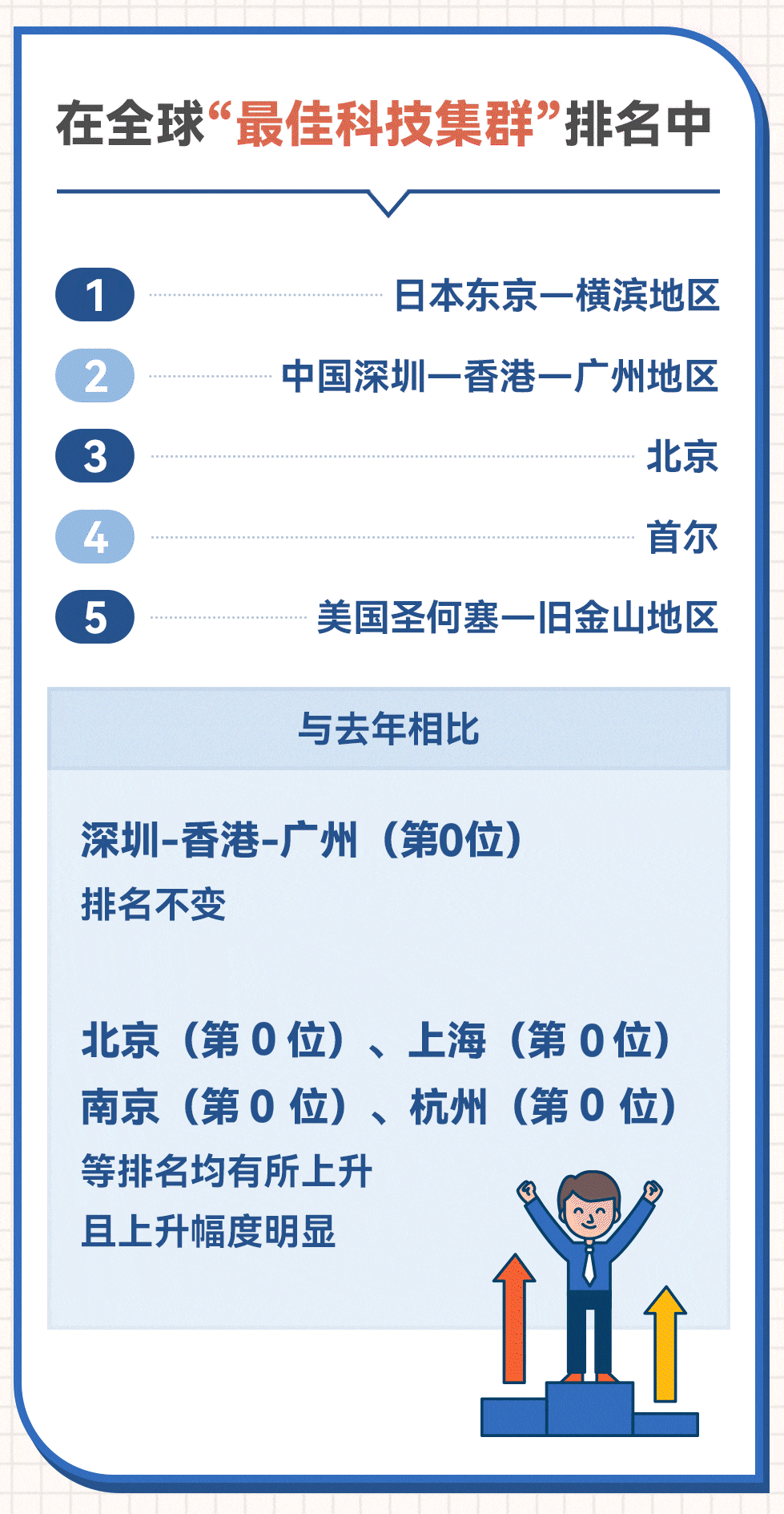 在全球“最佳科技集群”排名中,日本东京—横滨地区、中国深圳—香港—广州地区、北京、首尔、美国圣何塞—旧金山地区分列前五。与去年相比,深圳—香港—广州(第2位)排名不变,北京(第3位)、上海(第8位)、南京(第18位)、杭州(第21位)等排名均有所上升,且上升幅度明显。