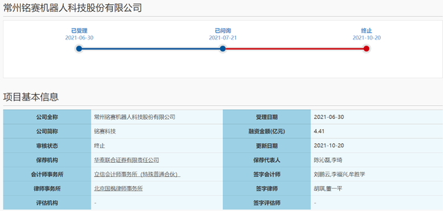 10月21日,常州铭赛机器人科技股份有限公司(下称“铭赛科技”)科创板IPO变更为“终止”。