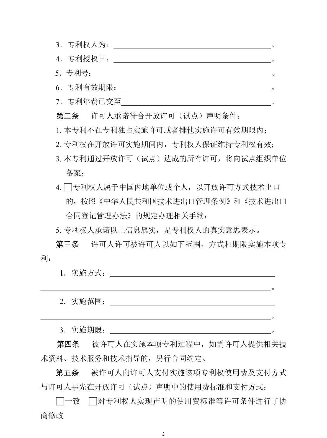 2. 做好交易保障。试点省局明确的区域范围(可不限于本省)内,任何单位和个人接受信息表中公布的许可条件的,原则上专利权人应遵守承诺,不得拒绝达成许可。试点省局提供专利开放许可(试点)合同样例(见附件2),引导许可双方明确基本权利义务,对必要事项进行约定,保障许可交易安全,促成快速许可。双方当事人可以对许可合同内容自行协商。专利权人提交许可信息表后进行专利权转移的,应当提请试点省局撤回已公布的信息。