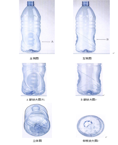 1.相同点:整体形状相同,均是瓶身为圆柱体,上部内缩直至形成瓶口,内缩部分具有装饰的形状或图案,瓶身上下基本相同位置有环绕瓶身的装饰线。(1)本专利内缩部分的装饰为高低起伏不规则的折线装饰设计,形成山峰状,将内缩部分包围在其中;而对比设计1相应部分的装饰为三条三组波浪形花纹。(2)瓶身上的线圈,对比设计1上下部各是一条,本专利上部是2条,下部是3条。(4)本专利瓶底内凹,并由多个不同直径的同心圆组成,证据1瓶底只有2圈且未显示是否凹陷。(5)本专利瓶口螺纹部结束的地方有凸出的圆边,其与瓶肩还有一段瓶颈,对比设计1瓶盖遮住了相应部位没有显示。